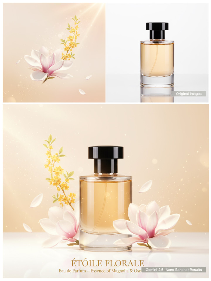 AI能够将孤立的产品图(上右)与背景元素(上左)智能融合,快速生成完整且氛围感十足的商业视觉(下),极大地加速了概念探索过程。
